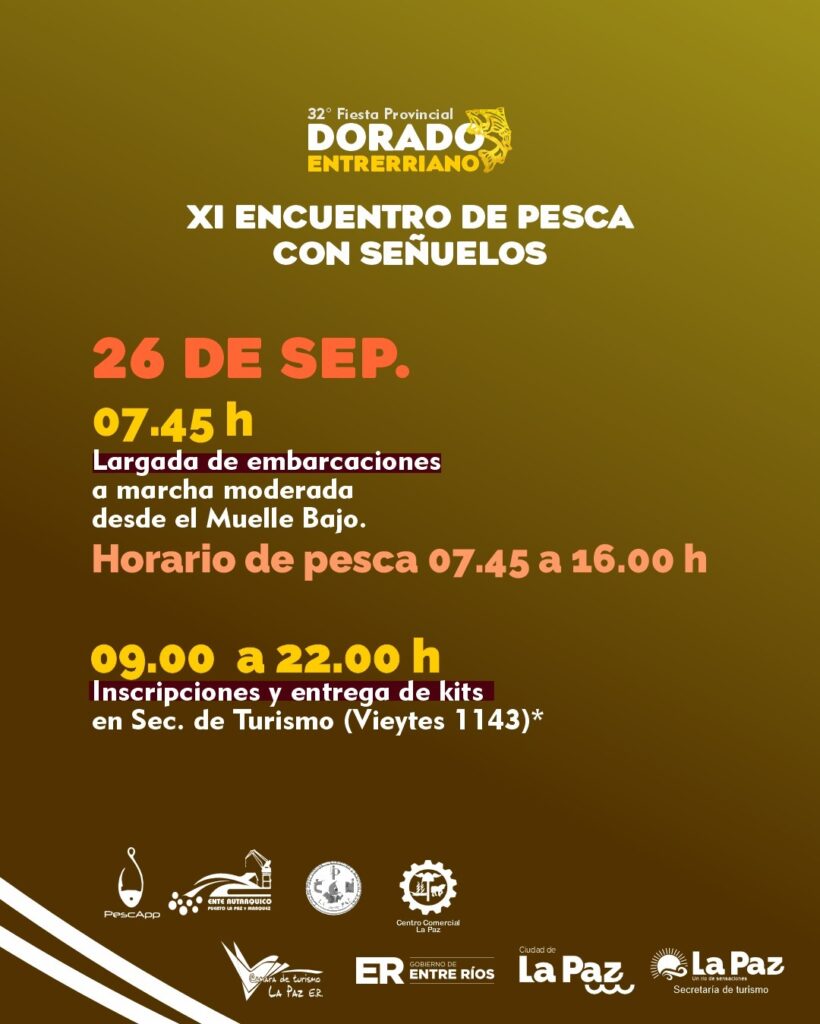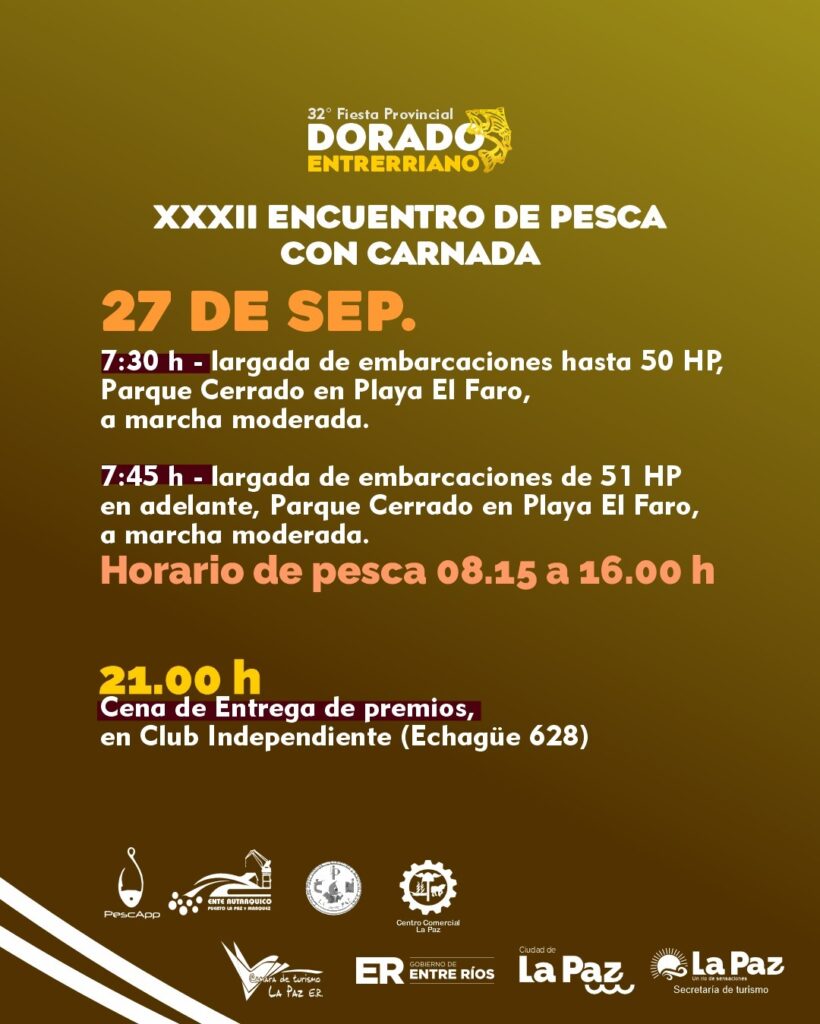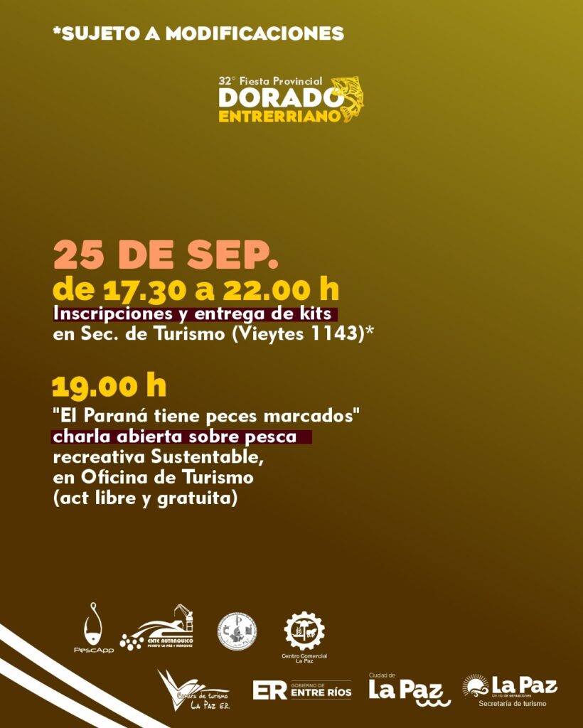 A continuación, compartimos los días y horarios de las actividades previstas para la 32ª edición de la Fiesta Provincial del Dorado Entrerriano, que se realizará en nuestra ciudad, los días 25, 26 y 27 de septiembre de 2025.
