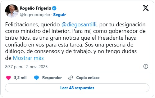 El gobernador Rogelio Frigerio felicitó a Diego Santilli por su designación como ministro del Interior. “Como gobernador de Entre Ríos, es una gran noticia que el Presidente haya confiado en vos para esta tarea”, sostuvo el mandatario a través de sus redes sociales.