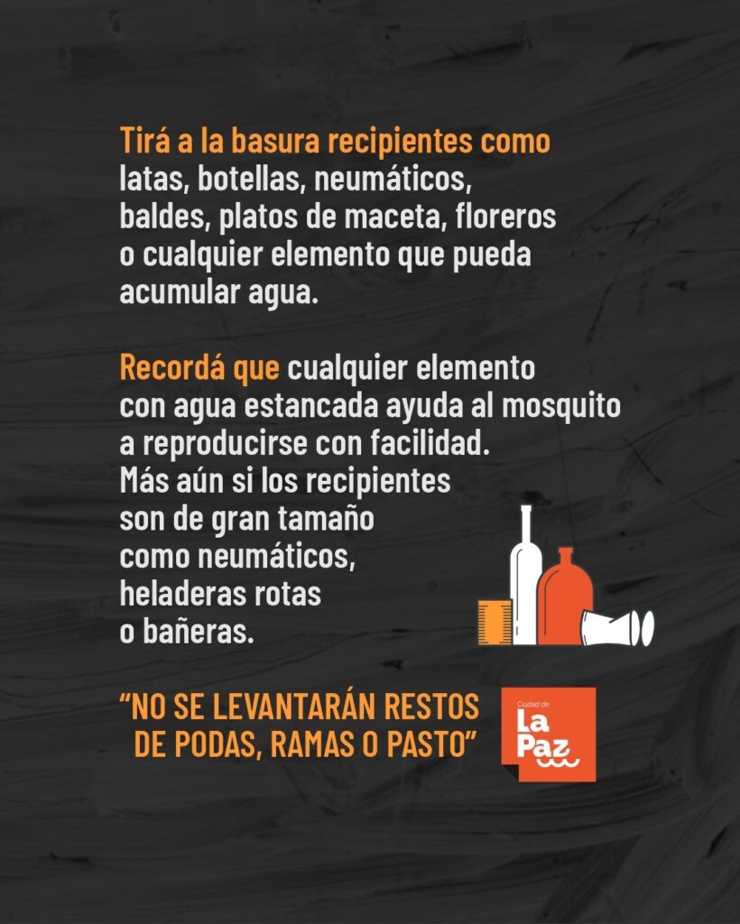 latas, botellas, neumáticos, baldes, platos de maceta, floreros, heladeras o electrodomésticos rotos, bañeras, o cualquier elemento que pueda convertirse en criadero.